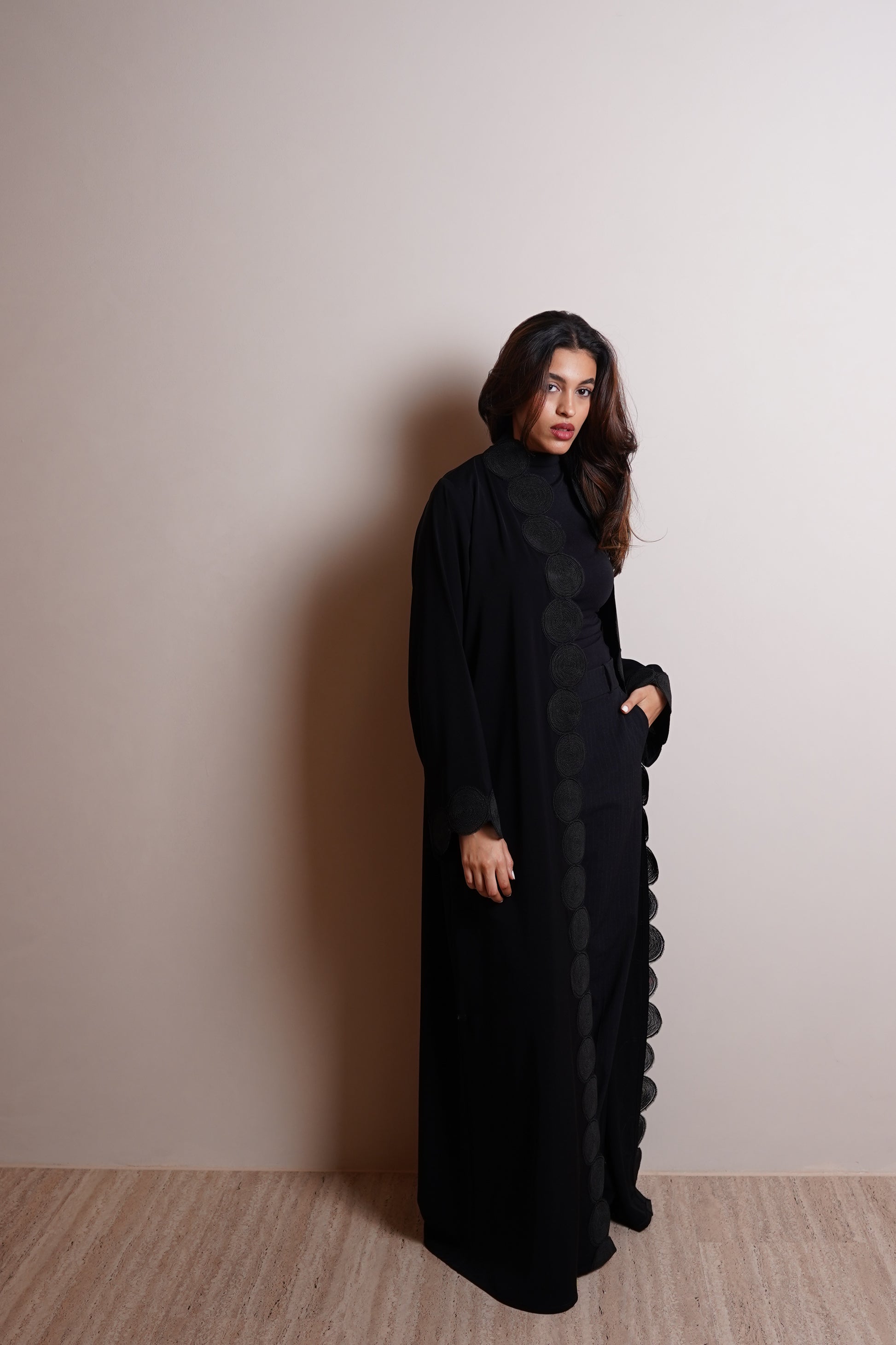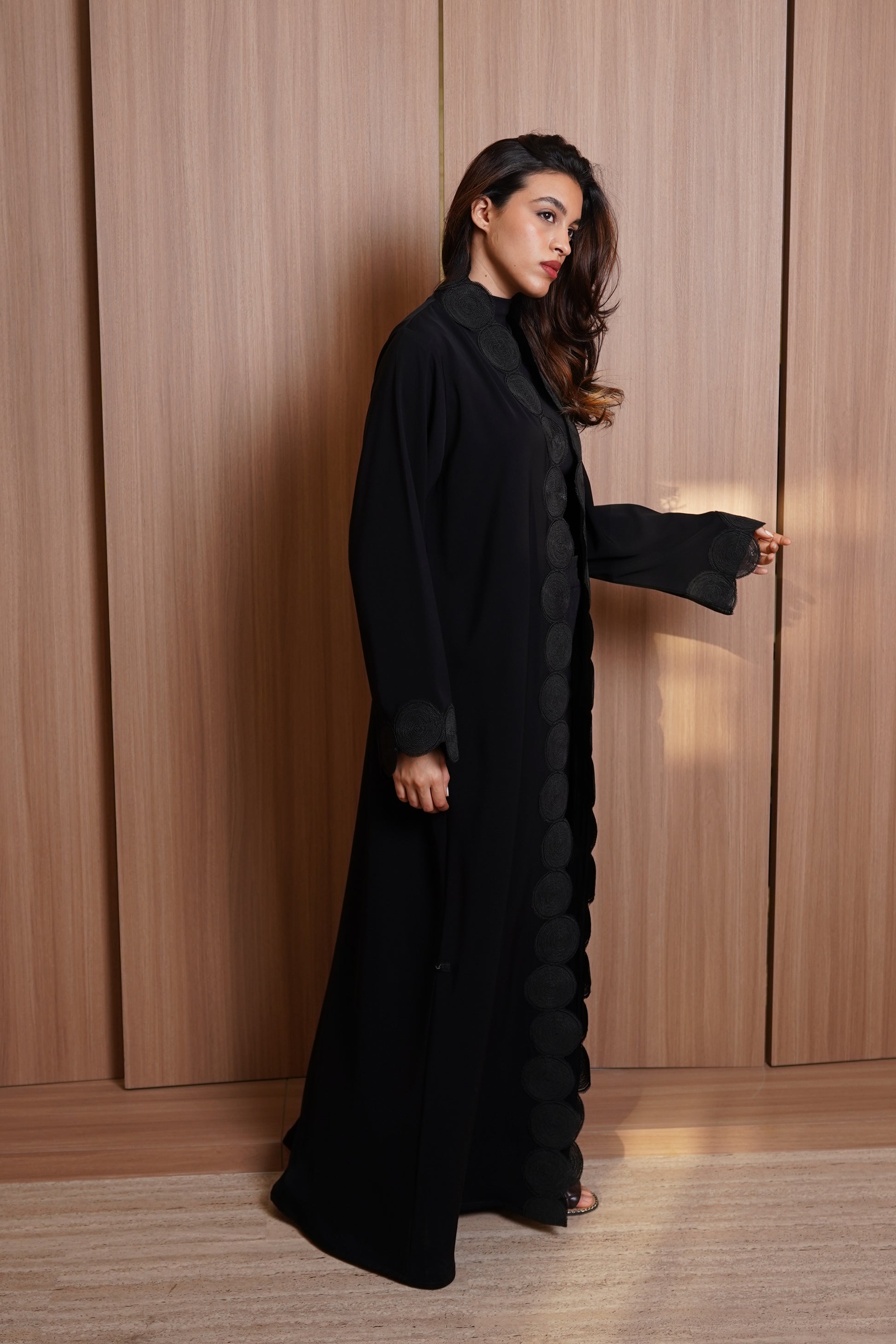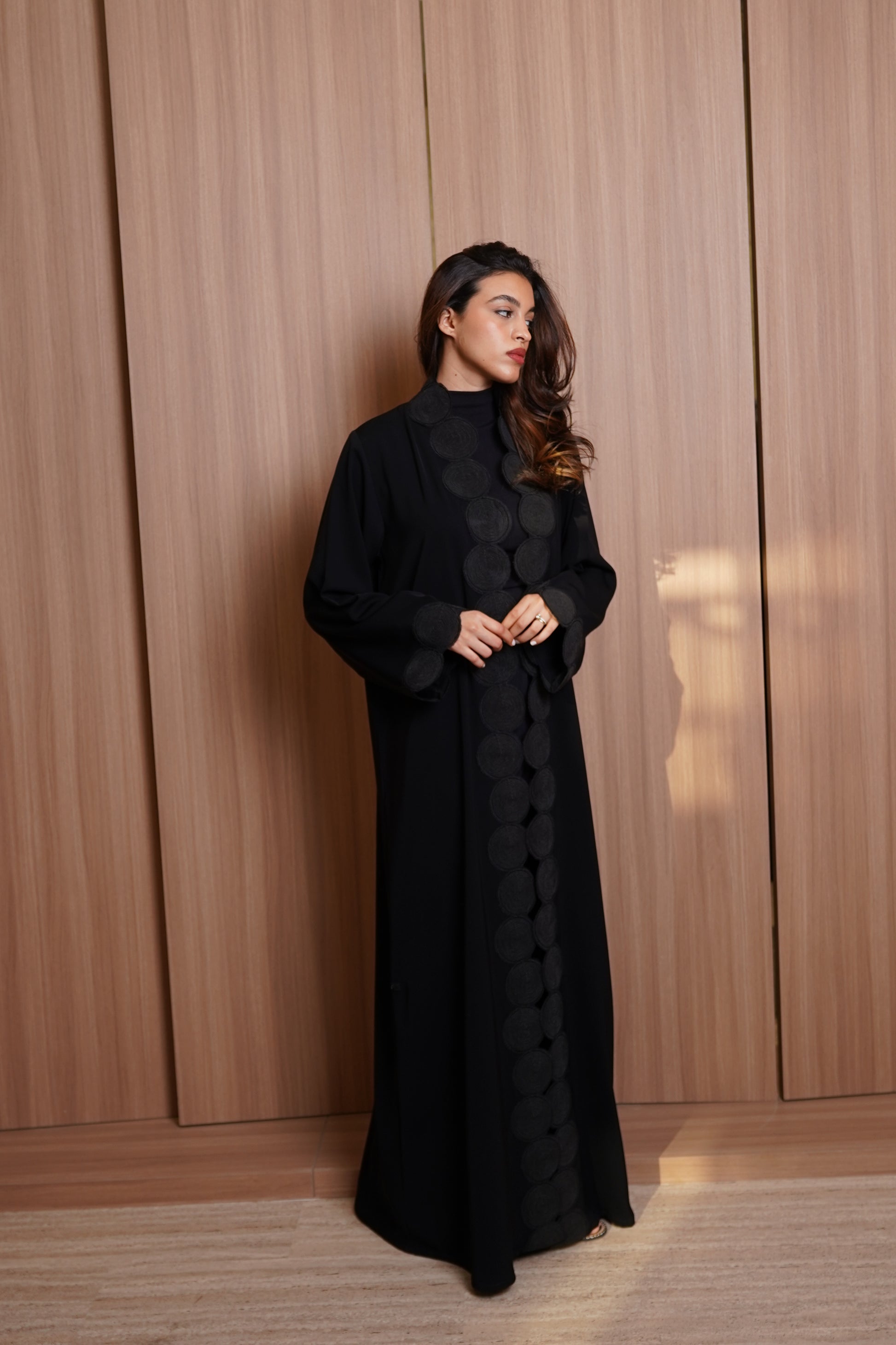 This elegant abaya is crafted from Nada fabric, known for its soft texture, lightweight drape, and delicate sheen. Adorned with striking round trims, the design brings a refined and contemporary touch. It is paired with a plain chiffon sheila, allowing the abaya’s detailing to stand out beautifully.