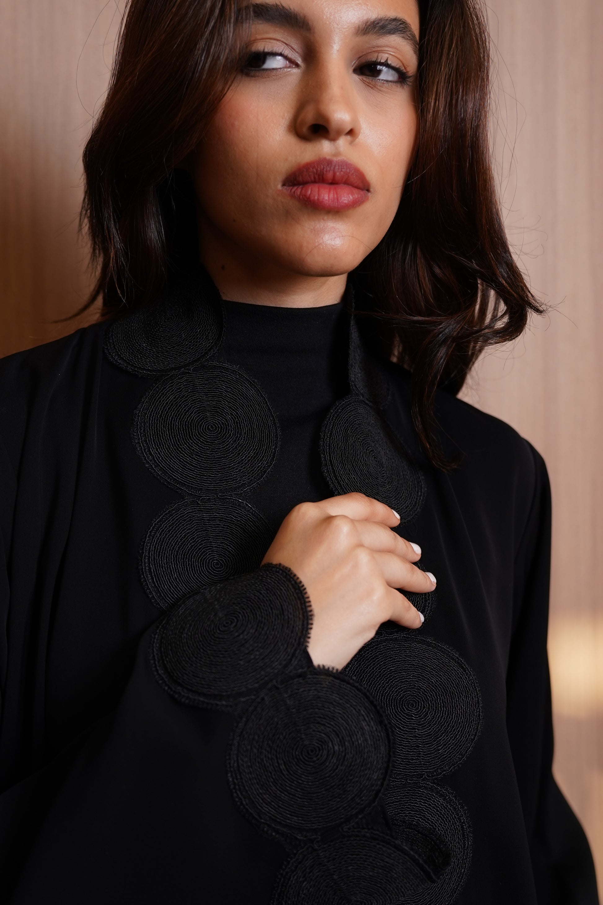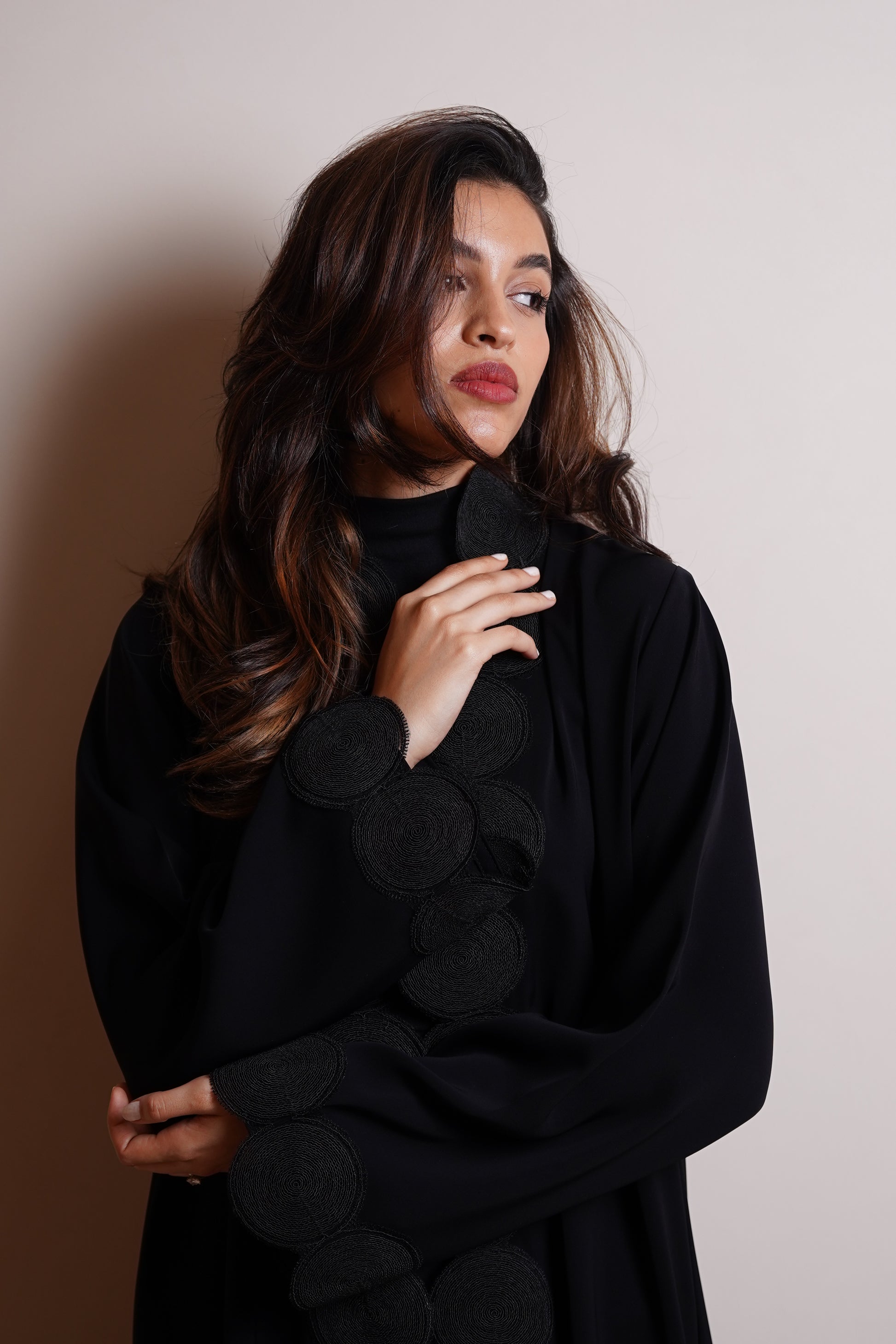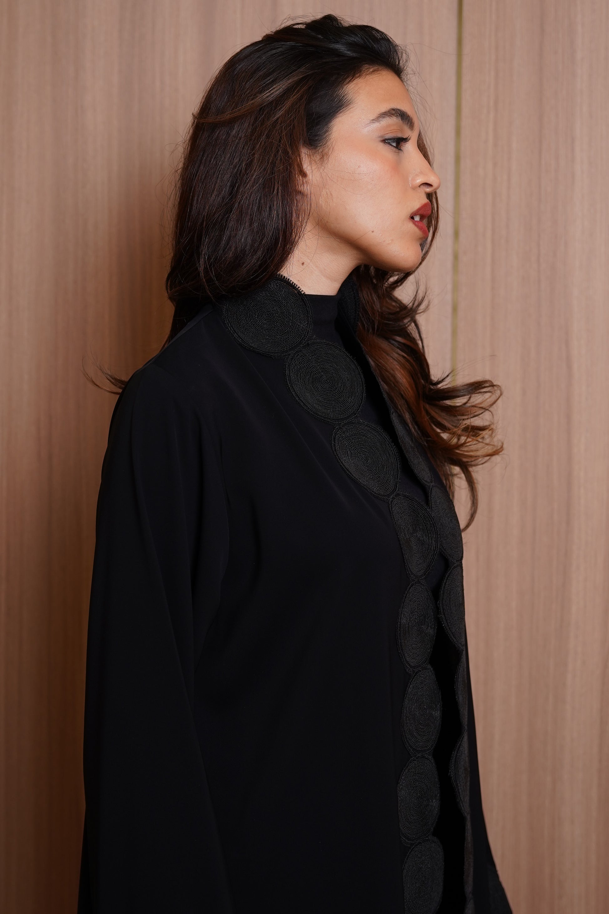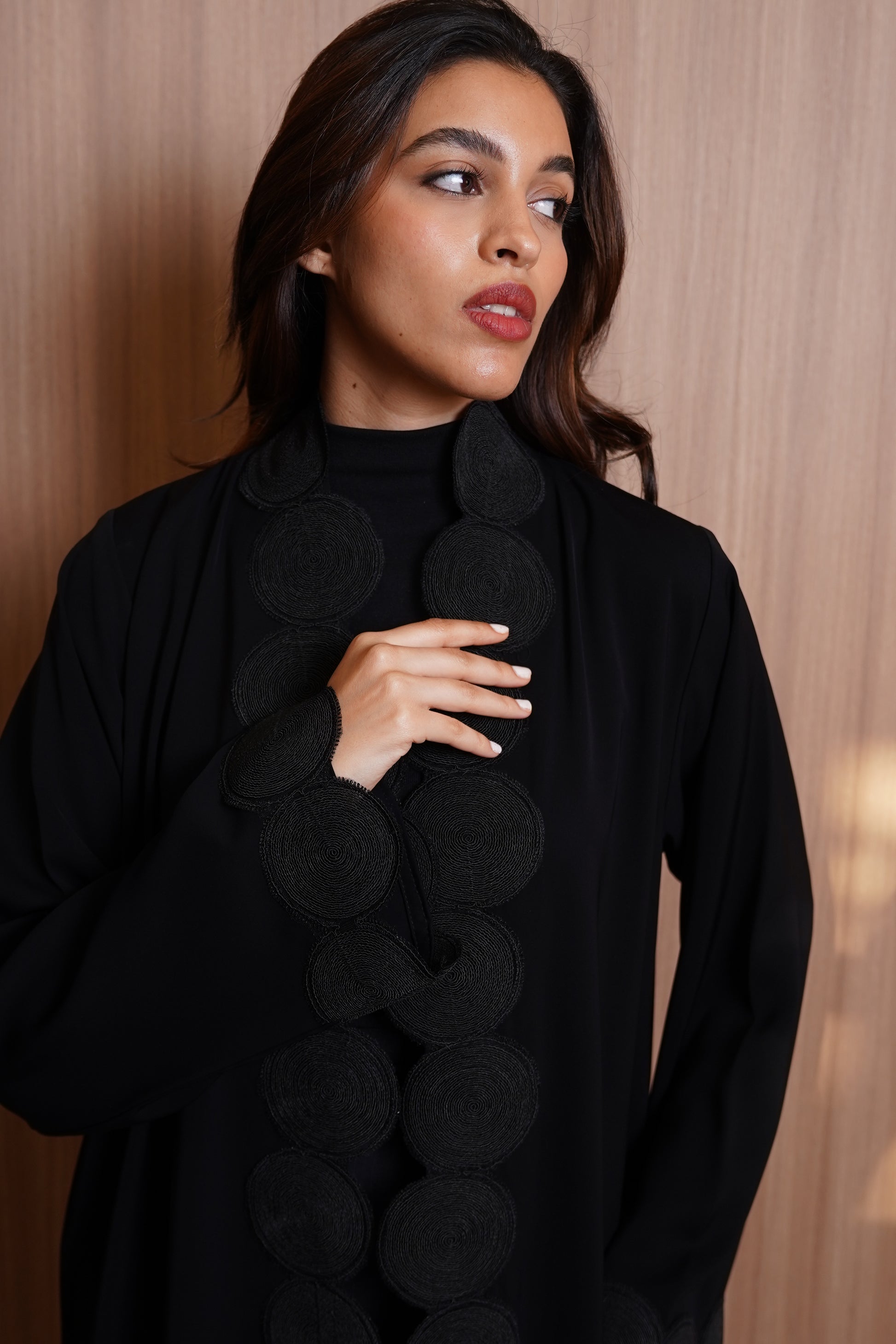 This elegant abaya is crafted from Nada fabric, known for its soft texture, lightweight drape, and delicate sheen. Adorned with striking round trims, the design brings a refined and contemporary touch. It is paired with a plain chiffon sheila, allowing the abaya’s detailing to stand out beautifully.