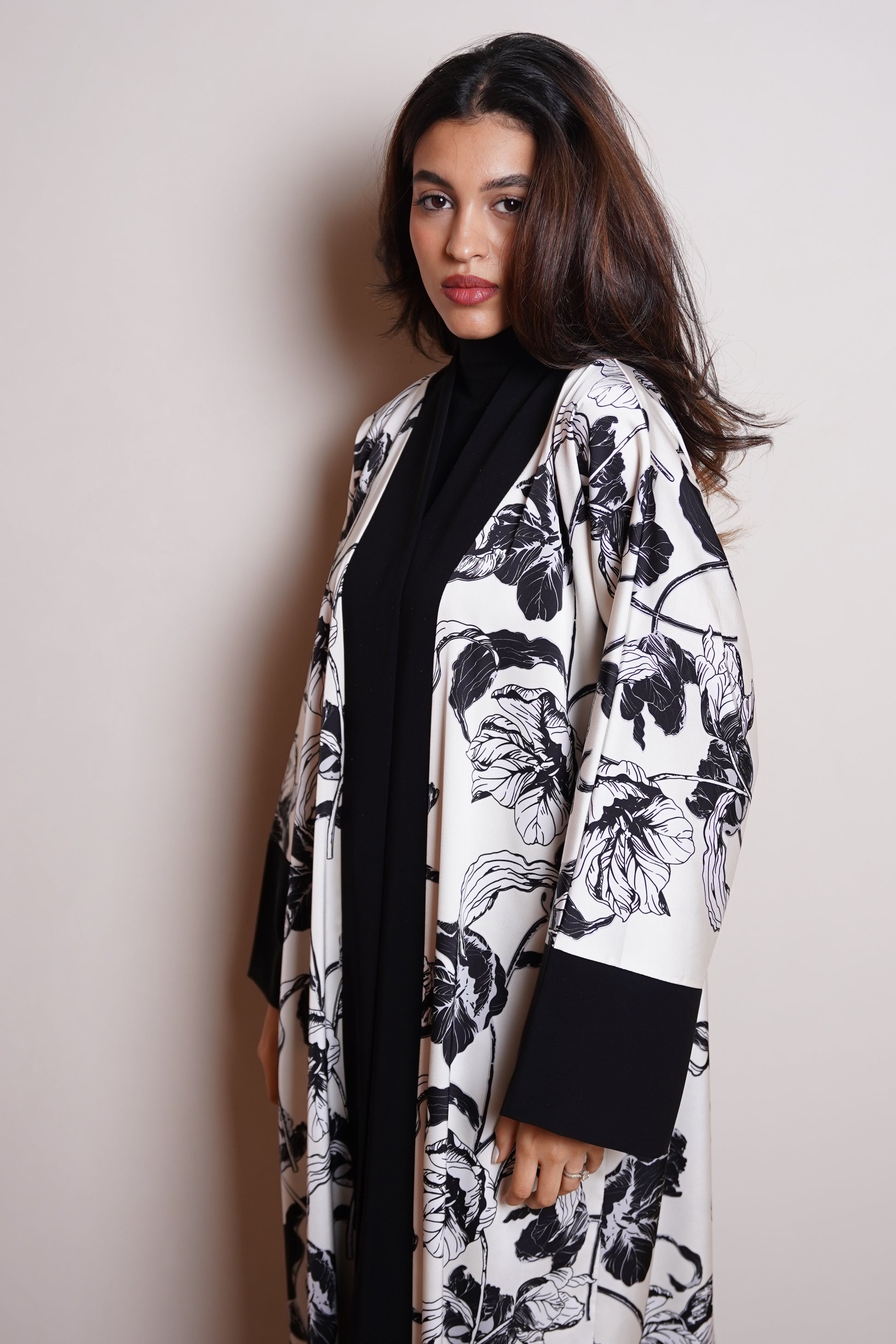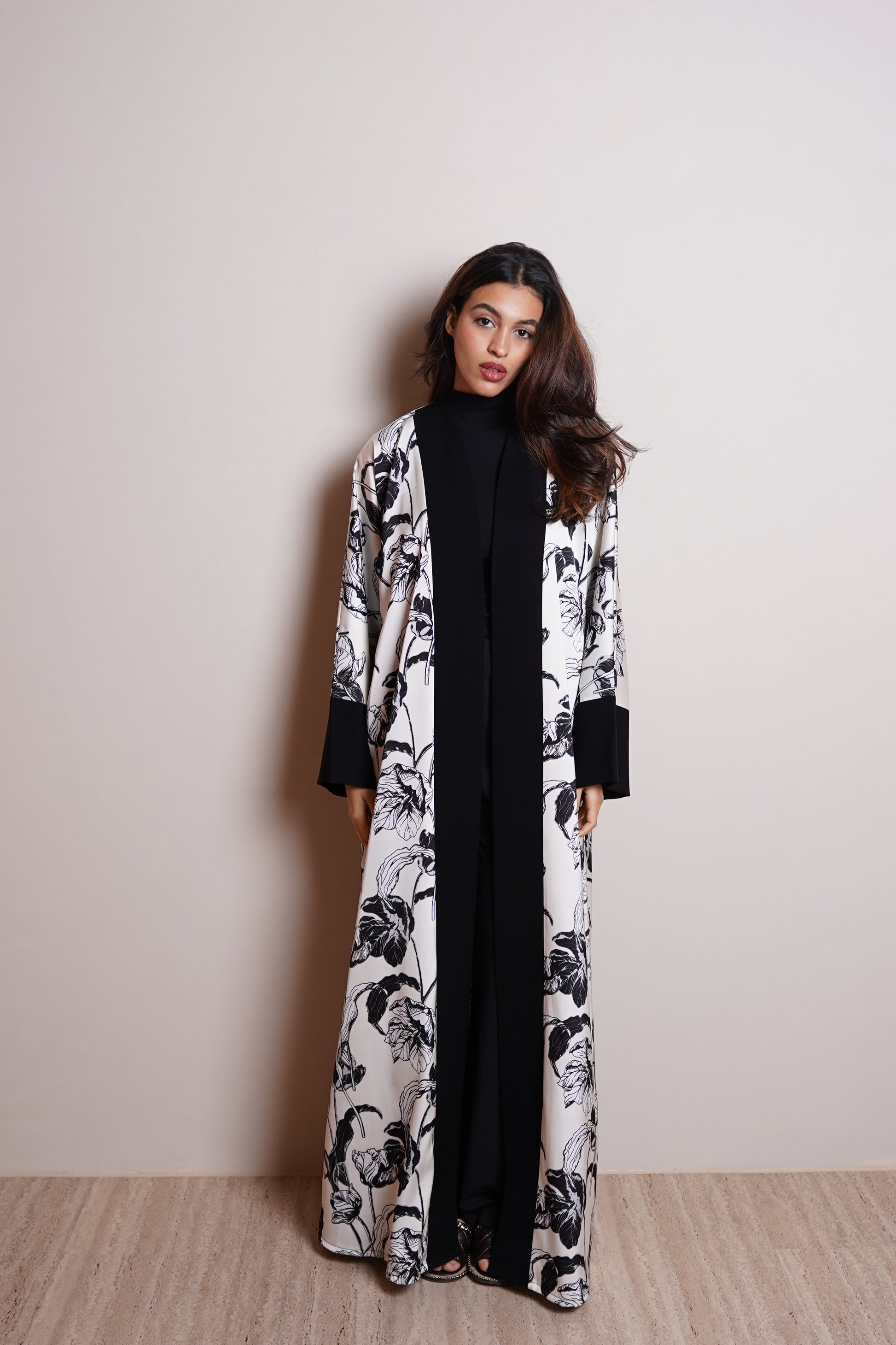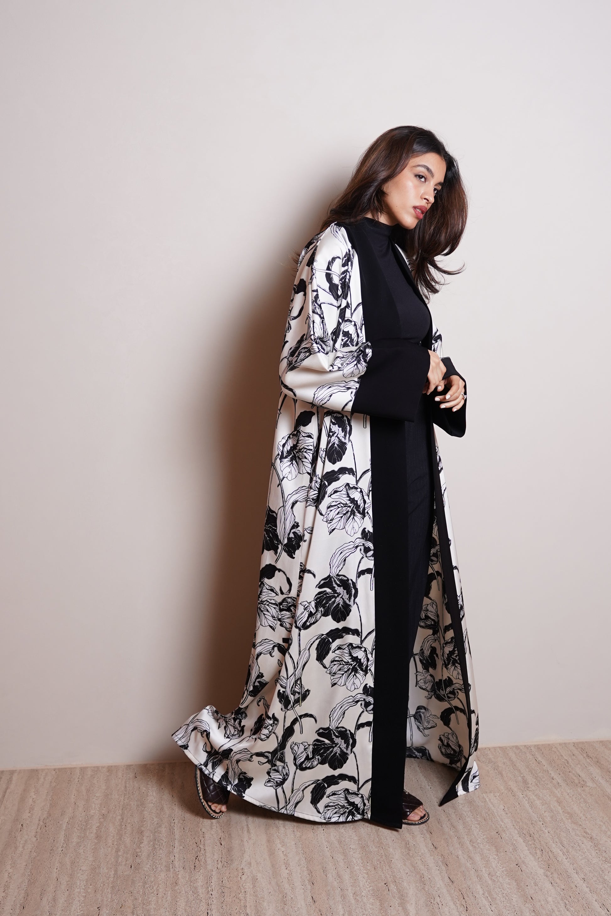 This sophisticated straight-cut abaya is designed with statement oversized sleeves, creating a bold yet refined silhouette. Crafted from a luxurious combination of printed silk and smooth satin, the design balances softness and structure, offering an elevated contrast in texture and flow. The clean front cut enhances its modern elegance, making it a timeless piece for both day and evening wear. Paired with a plain chiffon sheila, allowing the abaya’s fabric and silhouette to take center stage.