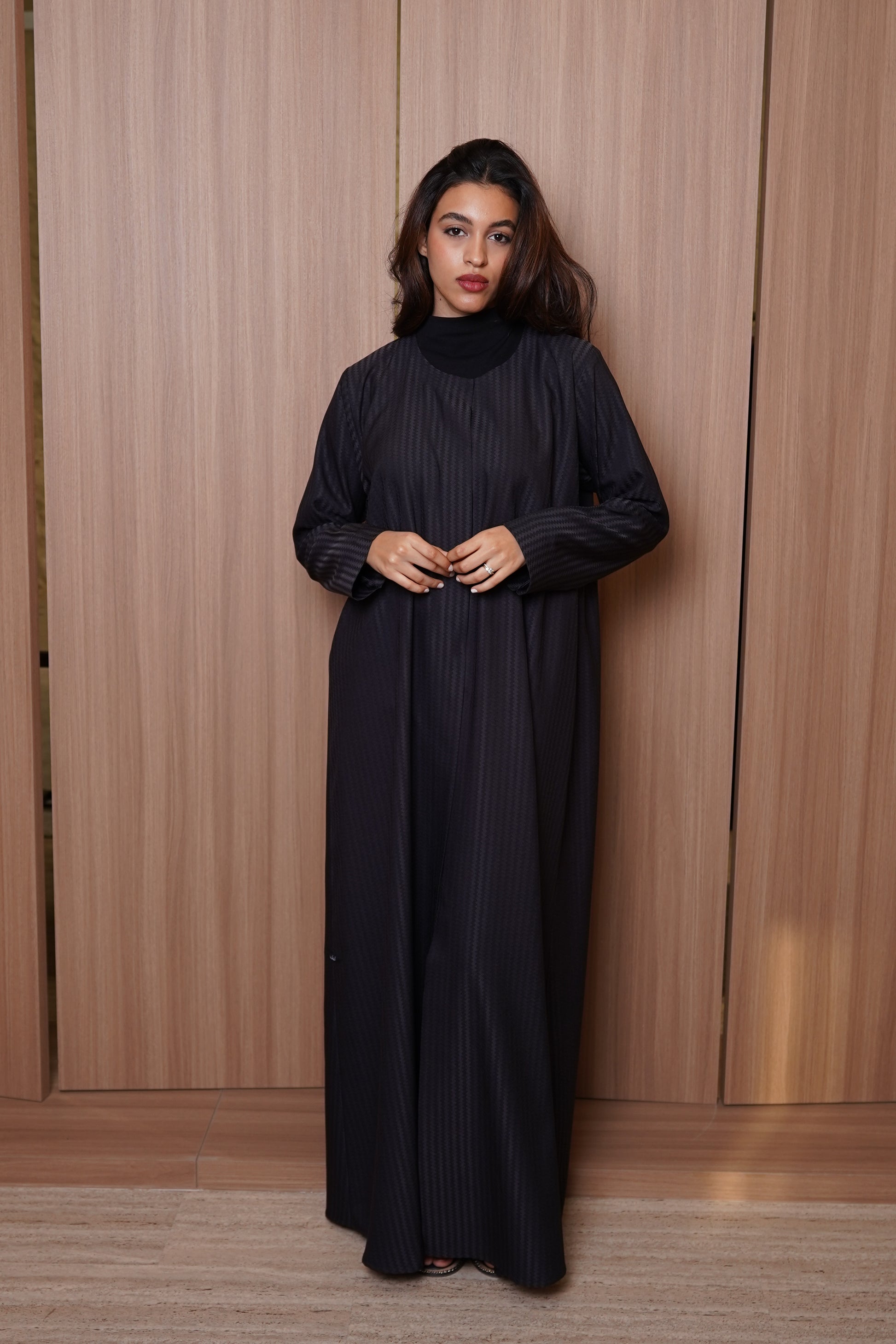 A refined abaya crafted from textured crepe with a subtle geometric weave that adds depth without overpowering its minimalist silhouette. Designed with a clean neckline and soft front paneling, this piece drapes effortlessly for a structured yet fluid look. Perfect for everyday elegance or elevated occasions, it’s a timeless essential that speaks through detail rather than excess.