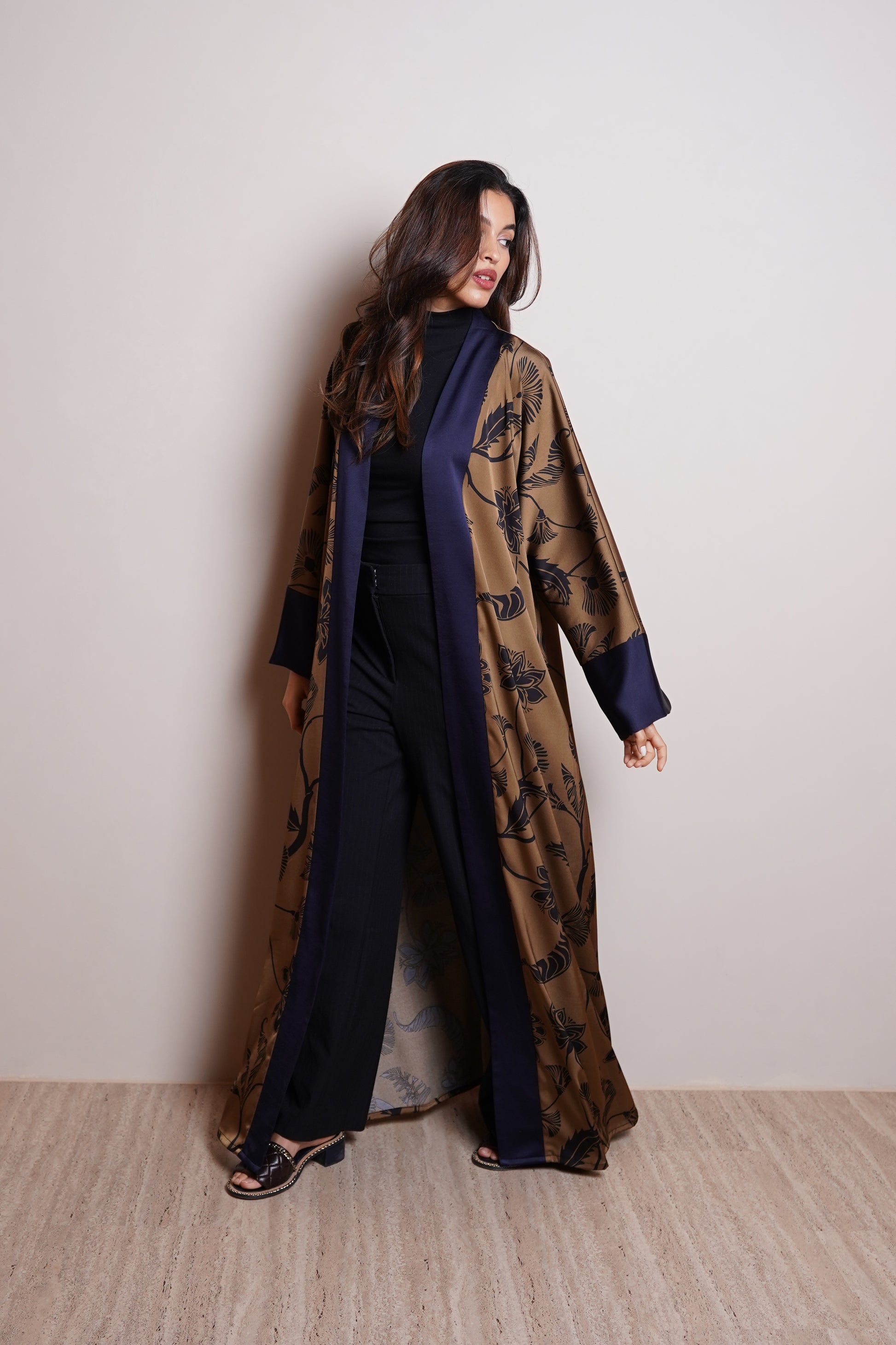 A refined expression of modern elegance, this open-style abaya is crafted from printed satin crepe, offering a smooth, fluid drape with a soft sheen. The design features an artistic botanical pattern in warm olive tones, beautifully contrasted with a deep navy inner panel for a layered, contemporary look. Finished with clean lines and a relaxed silhouette, this piece blends statement design with effortless wearability—perfect for both day and evening styling.